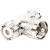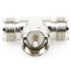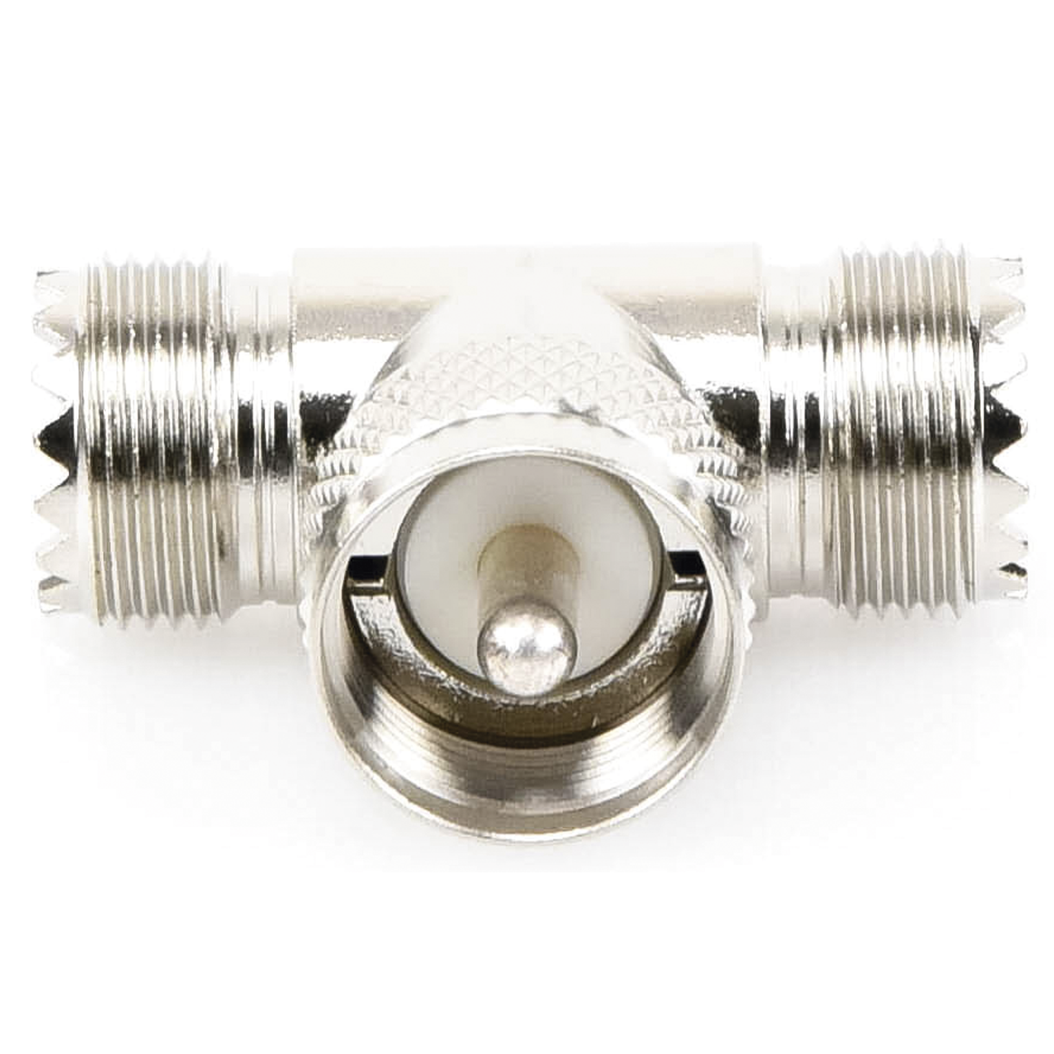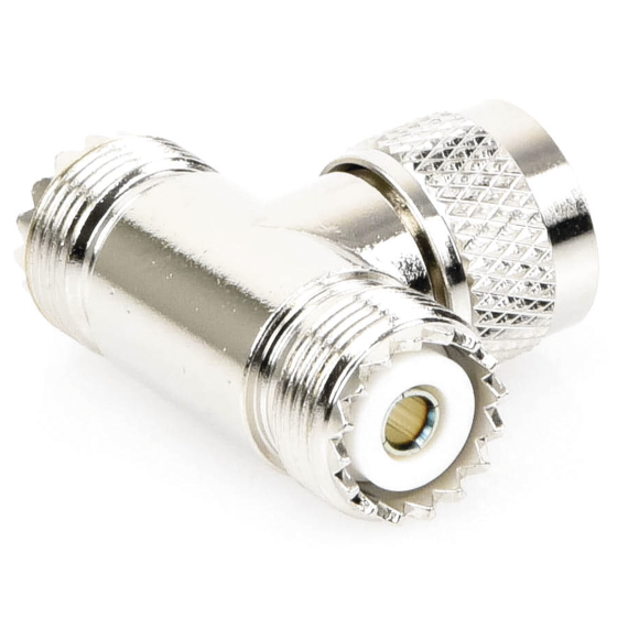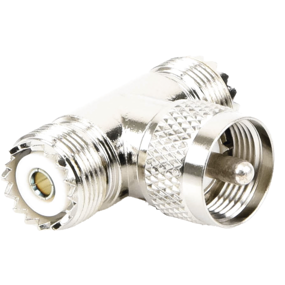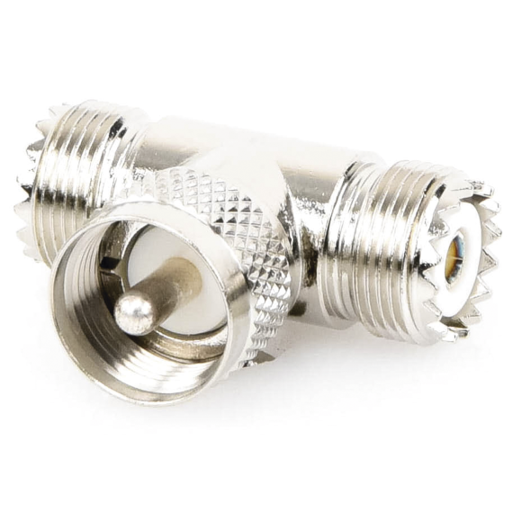 Adaptador RFU-533, en forma T, de Conector UHF Macho (PL-259) a Doble UHF Hembra (SO-239), Níquel, Plata, Delrin